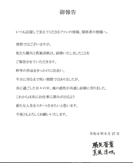 「昨年の作品をきっかけに出会い、今日に至るまで短い期間ではありましたが、共に過ごした日々の中、魂の感性が共感し結婚に至りました。これからは共にお仕事に深みが出るよう新たな人生をスタートさせたいと思います。