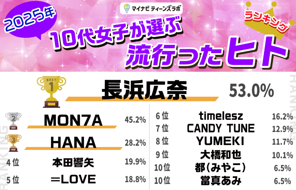 恋リアでのバズからショート動画、トレンドランキングや「かわいいトレンド大賞」受賞へと波及し、ティーン発の人気が次々とブームを生み出した結果、「2025年に最も流行った人」として選ばれたと言えるでしょう。