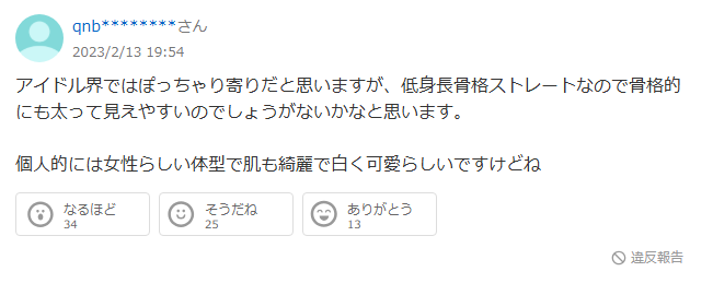 ヤフーのコメント欄を見ると、少しふっくらしているかもという声もありますが、女性らしくて可愛いという意見も多く見られます。